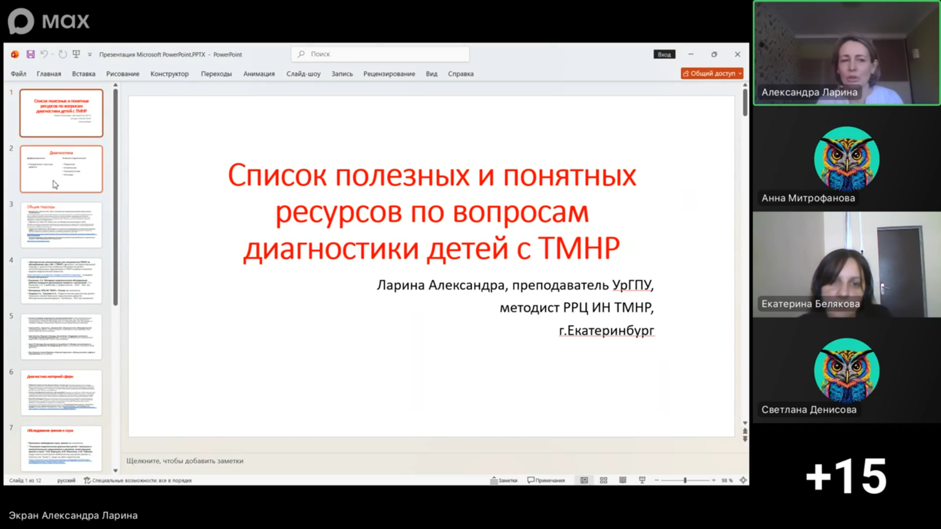 В заключение учитель-дефектолог Александра Ларина представила обзор полезных ресурсов, которые специалисты могут использовать в процессе диагностической работы.